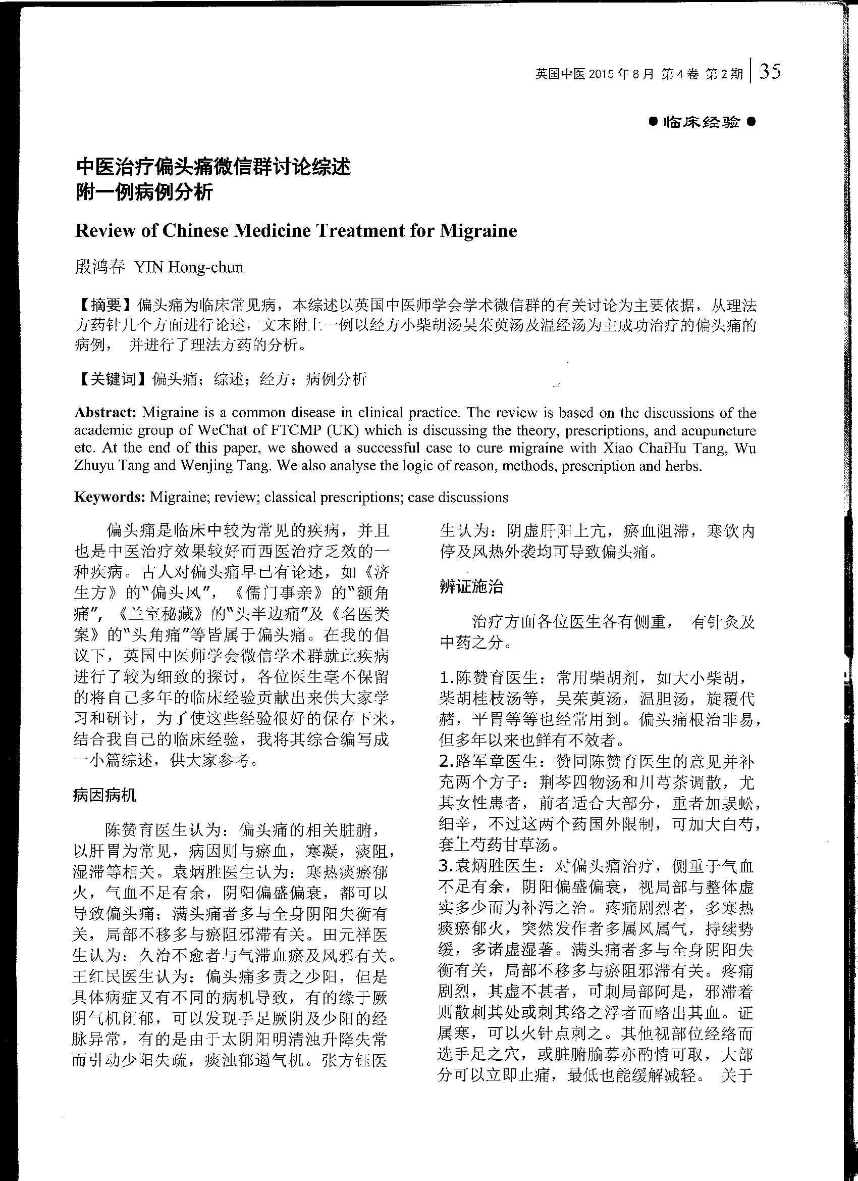 2015: Review of Chinese medicine treatment for migraine and one case study Journal of Chinese medicine in the UK, August 2015, Volume 2 Issue 2